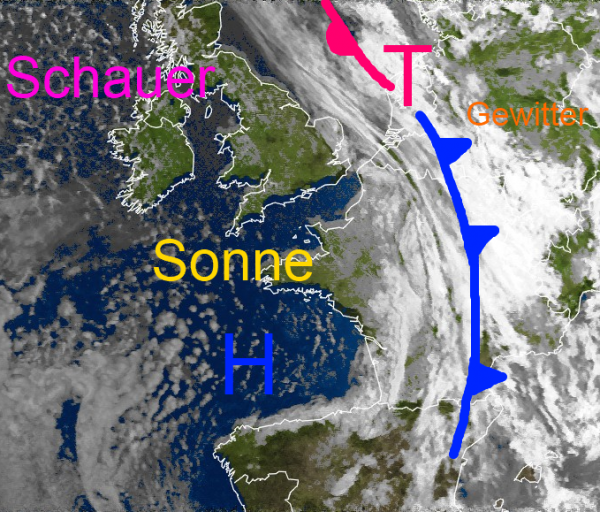 Die über Deutschland angelangte Kaltfront löst vor allem über der Mitte und im Osten teils kräftige Schauer und Gewitter aus. Hinter der Front wird die warme Frühsommerluft durch spürbar kühlere Atlantikluft ersetzt.