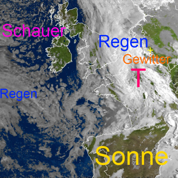 Die von der Nordsee bis nach Frankreich reichende Wolkenzone zieht nach Deutschland. Das darin vorhandene Tief sorgt im Tagesverlauf immer häufiger für Schauer und Gewitter, die teilweise kräftig ausfallen können. Dahinter kühlt die Luft ab und vom Atlantik rücken einige Schauerwolken nach.
