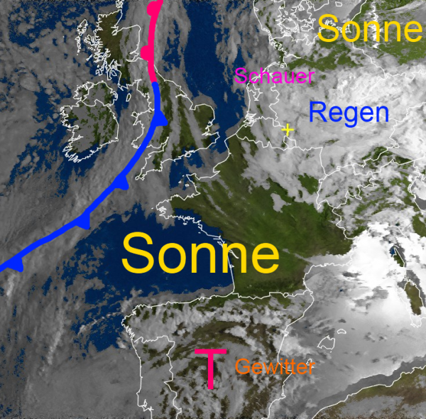 Reichlich Sonne und spätsommerliche Temperaturen findet man auch über großen Gebieten von Frankreich, sowie über Südwesteuropa, wenngleich das Tief über Spanien Wolken produziert, die es regional krachen lassen.