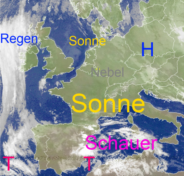 Dank des kräftigen osteuropäischen Hochdruckgebietes herrscht über weiten Teilen des Kontinentes ruhiges Herbstwetter. Dabei gibt es eine Mischung aus Sonne, Nebel oder tiefhängenden Wolken, die der Satellit jedoch nicht klar genug erfassen kann.