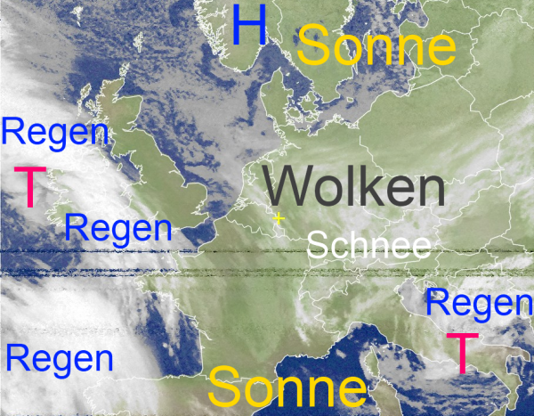 Über Mitteleuropa dominieren die Wolken. Ganz im Süden unseres Landes fällt Schnee, nur in tiefen Lagen auch Regen.