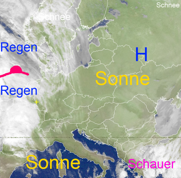 Mitteleuropa bildet momentan die Grenze zwischen den kompakten Regenwolken im Westen und dem freundlichen Hochdruckwetter im Osten. Letzendlich wird sich in den kommenden Tagen aber auch bei uns die Frontalzone mit den Regengebieten und der milderen Luft vom Atlantik durchsetzen.