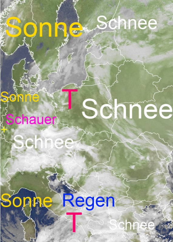 Das Tief über Polen zapft die kalte Luft von Norden an. Die Wolken stauen sich an den Nordrändern der Gebirge und bringen weiteren Schneenachschub. Nur im Flachland fällt der Niederschlag teilweise noch in flüssiger Form. Wegen des Skandinavien-Föhns gibt es im Nordwesten größere freundliche Abschnitte.