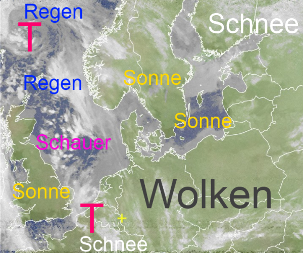 Über Mitteleuropa erkennt man dichte tiefhängende Wolken, aus denen regional auch etwas Schnee oder Schneegriesel fallen kann. Stellenweise gibt es einige Auflockerungen mit einigen Sonnenstrahlen.
