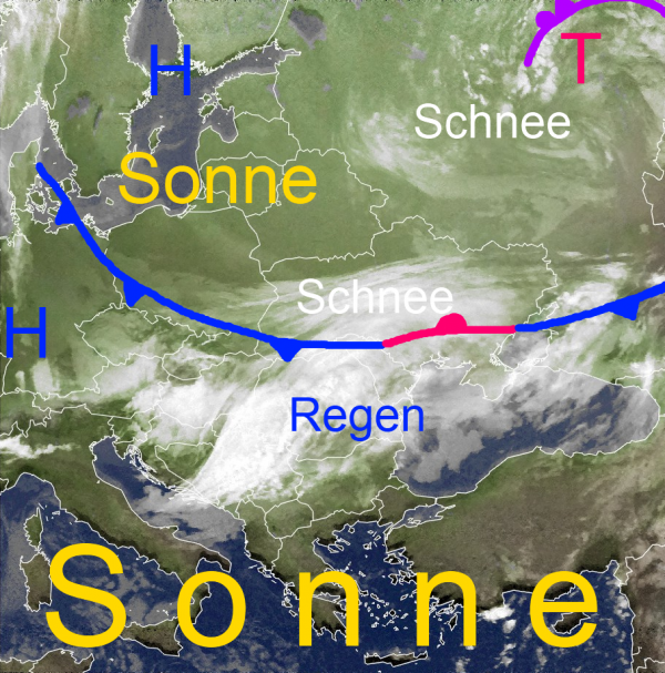 Zwischen dem Hoch über der nördlichen Ostsee und dem Tief über Russland gibt es derzeitig einen kräftigen polaren Kaltluftausbruch über Osteuropa. Davon bekommt in abgeschwächter Form auch der Nordosten unseres Landes etwas zu spüren. Die Luft hinter der Kaltfront ist meistens klar und trocken. Das Wolkenband bildet die Grenze dieser Luftmasse. Südlich davon fällt überwiegend Regen, im nördlichen Bereich Schnee.