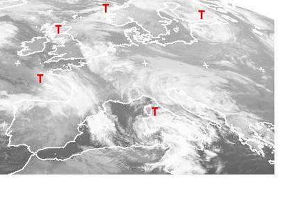 Tiefdruckgebiete bestimmen derzeit mit ihren Ausläufern das Wetter in weiten Teilen Europas mit dichten Wolken und Schnee oder Regen. Dabei sorgt ein Tief mit seinem Zentrum bei Korsika für teils kräftige Schauer und Gewitter mit teils stürmischem Wind im westlichen Mittelmeerraum. (Bildquelle: NERC Satellite Receiving Station, Dundee University, Scotland, http://www.sat.dundee.ac.uk/)