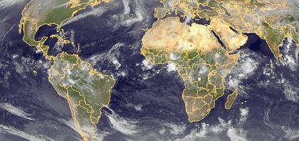 Auf dem Satellitenbild mit größerem Ausschnitt ist das Band der innertropischen Konvergenzzone zu erkennen, dass in Afrika und Südamerika verbreitet für Schauer und Gewitter sorgt.
