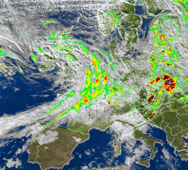 Das Satellitenfoto von heute Nachmittag zeigt über Westeuropa eindrucksvoll die Ausläufer des Sturmtiefs "ex-Kate" mit Kerndruck bei den Britischen Inseln. Besonders über den Britischen Inseln und über weiten Teilen von Frankreich herrscht oft stürmischer Wind oder Sturm. Im Laufe des Abends und der Nacht zieht das Sturmfeld in Begleitung kräftigen Regens auch über Deutschland hinweg, dabei sind auch schwere Sturmböen, teils auch orkanartige Böen bis ins Flachland nicht auszuschließen.