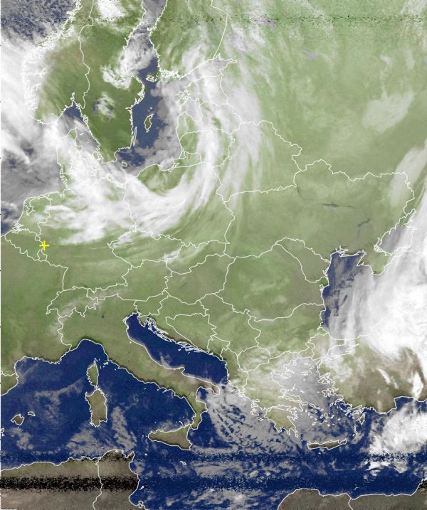 Das heutige Satellitenbild zeigt eine große Wolkenschicht die über den Nordosten Deutschlands her zieht. Hier gab es Eisregen am Vormittag. Nachmittags zieht es sich auch im Westeb zu. Der Süden Deutschlands ist noch nicht betroffen und hat somit einen klaren Himmel.