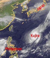 Auf dem Satellitenfoto ist über dem Pazifik südlich von Japan und nordöstlich der Philippinen der Taifun 'Kujira' zu erkennen. Er bewegt sich zur Zeit auf einer nordöstlichen Bahn und wird Japan in sicherer Entfernung von einigen 100km Entfernung passieren. Mit durchschnittlichen Windgeschwindigkeiten um 195 km/h, in der Spitze bis 240 km/h, schwächt er sich voraussichtlich ab dem morgigen Tag zögerlich wieder ab und wird ab spätestens Donnerstag zum tropischen Sturm herabgestuft werden.