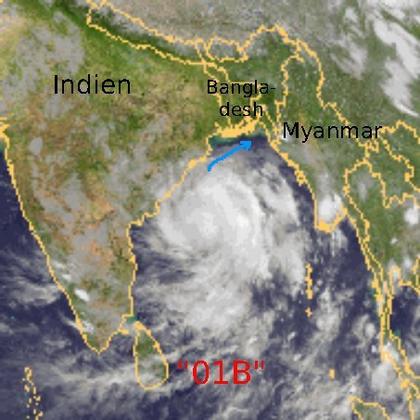 Der Wirbelsturm, der sich bereits gestern im Golf von Bengalen zeigte, hat sich bis heute zu einem Tropensturm weiterentwickelt und hat den Codenamen '01B' bekommen. Mit 65 km/h im Mittel und 95 km/h in Böen ist er aber weiterhin eher schwach. '01B' verstärkt sich in den nächsten Tagen weiter und zieht langsam in nordöstliche Richtung weiter. Ob er dabei Landmassen von Indien, Bangladesh oder Myanmar trifft, lässt sich derzeit noch nicht sicher vorhersagen.