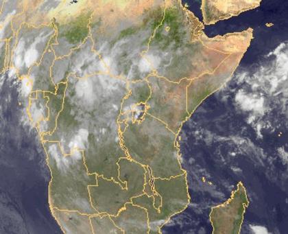 Auf dem Satellitenbild sind über Zentralafrika die Zellen tropischer Schauer und Gewitter erkennbar. Diese entwickeln sich im Bereich der innertropischen Konvergenzzone.