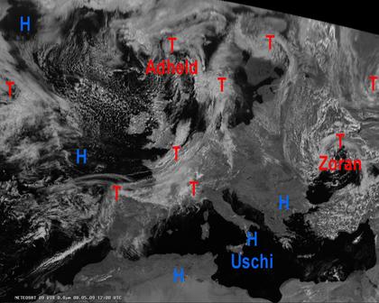 Auf dem Satellitenfoto von heute Nachmittag sind Tiefdruckgebiete vom Norden Spaniens, über Frankreich, den Beneluxstaaten bis nach Skandinavien zu erkennen. Zwei weiterer Tiefdruckgebiete liegen über Osteuropa. In den angesprochenen Regionen kommt es verbreitet zu Schauern, vereinzelt auch zu Gewittern. Deutlich freundlicher und weitgehend trocken ist es dagegen im gesamten Mittelmeerraum und in einem breiten Streifen von der Ostsee nach Süden bis zur Ägäis.