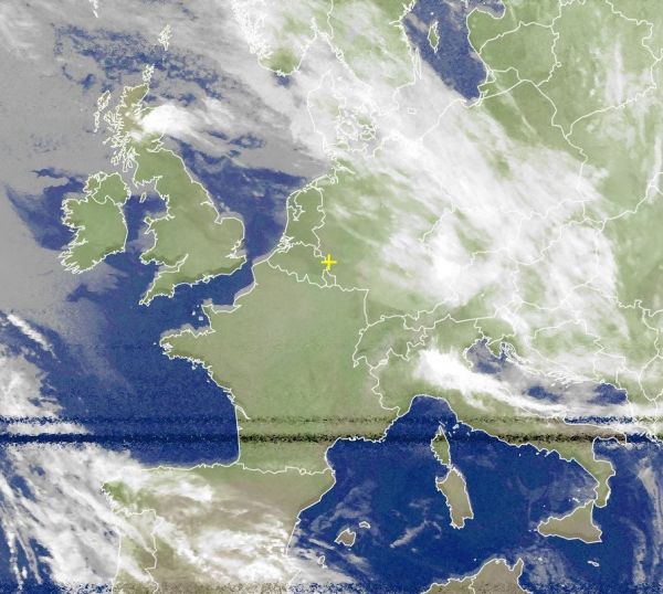 Eine dicke Wolkenschicht zieht mit einer nordwestlichen Strömung über Deutschland hinweg. Nur im Südwesten war es kurzzeitig noch heiter. Frankreich wird mit Sonnenschein durch das Hoch belohnt.