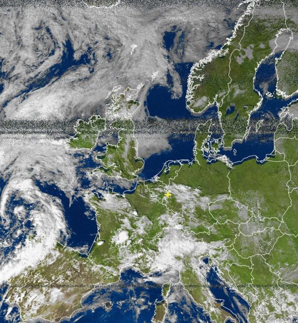 Auf der Satellitenaufnahme von heute Nachmittag sieht man den ausgeprägten Wolkenwirbel des Tiefdruckgebiets nordwestlich der Iberischen Halbinsel über dem Atlantik. In Portugal und gebietsweise auch im westlichsten Spanien bildeten sich vielfach kräftige Schauer und Gewitter, dabei waren auch unwetterartige Gewitter mit sintflutartigen Regenfällen mit dabei. Einige, wenige Gewitterzellen sind darüber hinaus auch noch über Frankreich zu erkennen, hier hatten vor allem in der Nacht zum Donnerstag teils schwere Unwetter getobt.