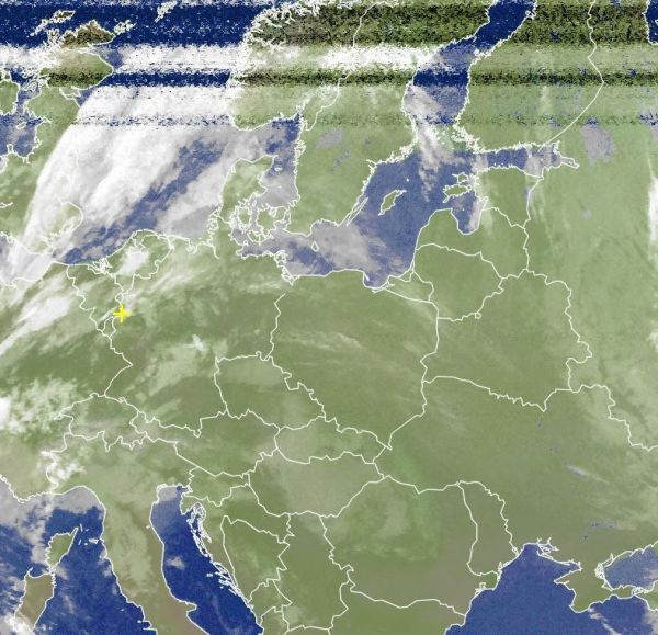 Auf dem Satellitenfoto von heute Nachmittag zeigen sich weite Teile von Mittel-, Ost-, Südost- und Südeuropa aufgelockert oder nur leicht bewökt. Hier herrscht unter dem Einfluss von Hoch "Brigitte" mit Kern über Norditalien verbreitet recht freundliches und ruhiges Herbstwetter. Ein dichtes Wolkenband erstreckt sich dagegen von Nordfrankreich, über den Südosten der Britsichen Inseln bis nach Skandinavien, hier herrscht meist sehr windiges und oft regnerisches Wetter.