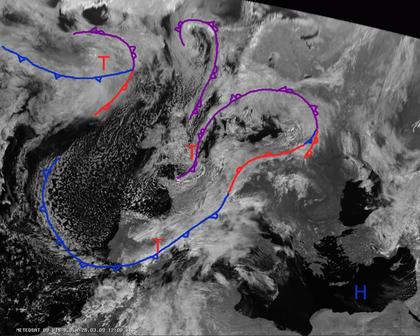 Zahlreiche Wolkengebiete finden sich heute Mittag über Europa. So liegen die dichten Wolken mehrerer Tiefdruckgebiete von Spanien über Frankreich bis nach Skandinavien, aber auch über den Brtitischen Inseln. Hochdruckeinfluss beschert dem östlichem Mittelmeer und Teilen Südosteuropas wolkenärmeres Wetter. Auf dem Atlantik zeigen sich noch einige Schauerzellen im Bereich einer Kaltfront, allmählich nimmt der Hochdruckeinfluss hier aber zu und dehnt sich zum Wochenanfang auch auf Mitteleuropa aus.