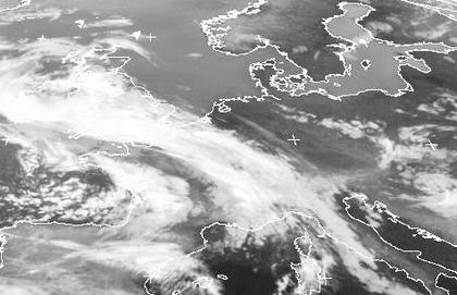 Das skandinavische Hoch 'Paul' sorgt auch weiterhin für meist nur geringe Bewölkung auch in weiten Teilen Deutschlands. Das Wolkenband eines Ausläufers von Tief 'Birgrit' über dem Kanal erstreckt sich aber von den Britischen Inseln über Ostfrankreich bis nach Norditalien. Es zieht langsam in den Südwesten Deutschlands, wo es teils kräftigen Regen bringt. Aber auch über Westfrankreich und der Biskaya sindet man die Bewölkung von Schauern und Gewittern. (Bildquelle: NERC Satellite Receiving Station, Dundee University, Scotland, http://www.sat.dundee.ac.uk/)