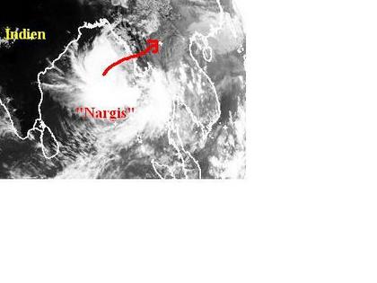Der Zyklon 'Nargis' im Golf von Bengalen erreicht zurzeit mittlere Windgeschwindigkeiten von 130, in Böen 157 km/h und ist etwas nach Nordosten gezogen. Berechnungen zufolge soll er am Samstag mit Windgeschwindigkeiten von 119, in Böen 185 km/h auf die Küste von Myanmar treffen, und unter leichter Abschwächung weiter ins Landesinnere ziehen. (Bildquelle: NERC Satellite Receiving Station, Dundee University, Scotland, http://www.sat.dundee.ac.uk/)
