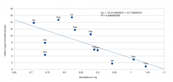 Bezogen auf die Temperatur zeigt sich, dass die Sterbeziffer deutlich ansteigt, je mehr wir uns von dem angenehmen Temperaturbereich um 23 Grad entfernen.