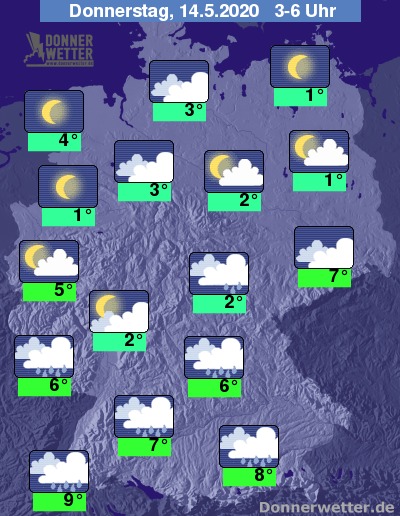 Bereits in der Nacht zu Donnerstag ist das Frostrisiko nur noch als gering einzustufen; vor allem im von dichten Wolken geschützten Süden liegen die Lufttemperaturen teils deutlich über der 5-Grad-Marke.