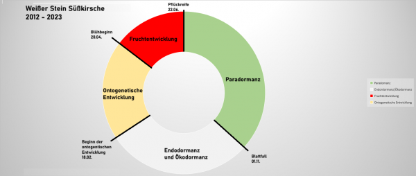 Die vorbereitende Blühphase im Freiland stellt sich in der auf die Ökodormanz folgenden Ontogenischen Phase zwischen Mitte/Ende Februar und Anfang März ein und endet mit der Blüte der Pflanze. Zum Ende der Ökodormanz sowie während der Ontogenischen Phasen spielen dann die Temperaturen eine entscheidende Rolle für die weitere Pflanzenentwicklung. Auf die Ontogenische Phase folgt mit Blühbeginn im Frühling die Zeit bis zur Fruchtreife - diese Phase wird ab dann von der Paradormanz abgelöst, die widerum mit dem Blattfall in die Endodormanz übergeht und somit den chemischen Kreislauf der phänologischen Entwicklungsphasen schließt.