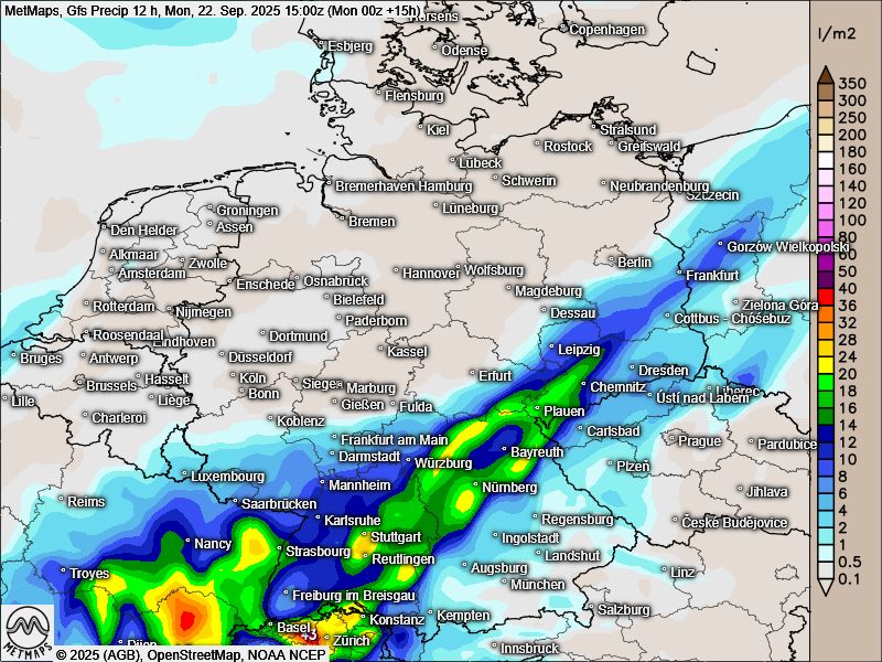 Die Karten zeigen die 12-Stunden Regenmengen sowie Lufttemperaturen und die Bewölkung am Montagnachmittag nach GFS: