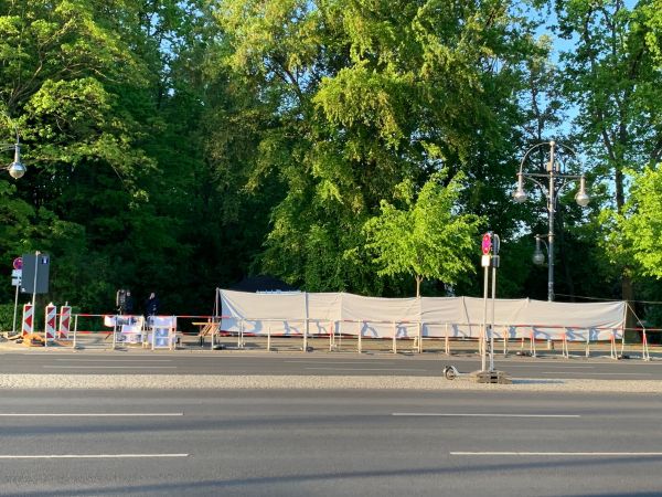Wolkenlos-rein und stahlblau - so zeigte sich der Himmel heute früh über dem Sowjetischen Ehrenmal im Berliner Tiergarten - am gestrigen "Tag der Befreiung" Ort der Spaltung.