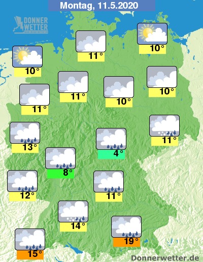 Der Muttertagssonntag ist dann bereits überall deutlich wechselhafter, wenn auch nur ein wenig kühler. Immer wieder wechseln sich Sonne, Wolken, Schauer und regionale Gewitter ab, die Temperaturen erreichen in der Spitze 13 Grad in Ostfriesland und 26 Grad am Oberrhein.
