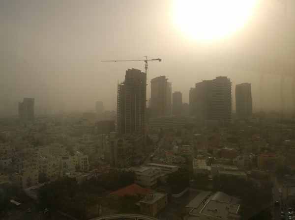 Da die Westströmung zur Zeit einen extremen Knick über dem Atlantik nach Süden macht, kommt im Augenblick staubreiche Luft aus der Sahara nach Norden. Der Himmel ist daher in weiten Teilen Deutschlands milchig. Morgen und übermorgen kann dann aus einzelnen Schauern 'Blutregen' fallen. Ein paar Tropfen fallen und zusammen mit dem Staub in der Luft gibt es gefärbte Autos. Die Autowaschstraßen werden in den nächsten Tagen gut zu tun haben. Unser Bild entstand in Tel Aviv in Israel, wo Saharstaub sehr häufig zu beobachten ist.