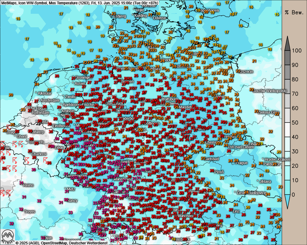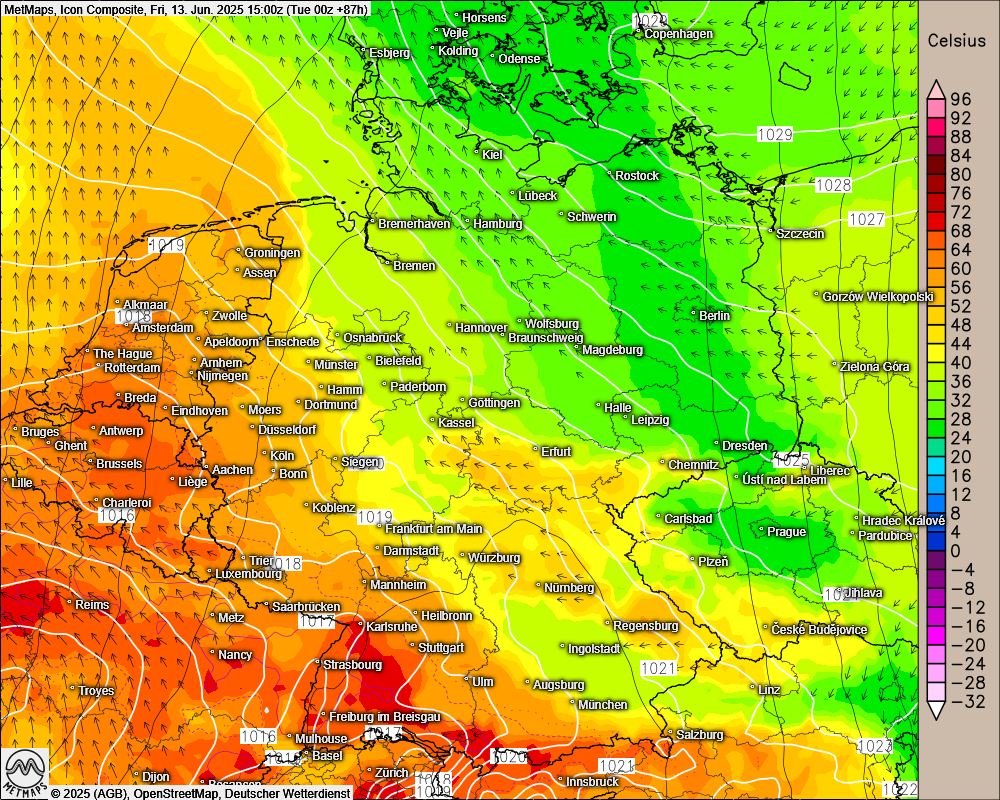 Am Freitag bahnt sich die warme Luft dann ihren Weg weiter in Richtung Norden. Hier bewegen sich die Tageshöchstwerte dann bereits bei 21 Grad an den Küsten und 26 Grad in Hamburg. Im Westen und Südwesten ist bei bis zu 33 Grad Schwitzen angesagt.