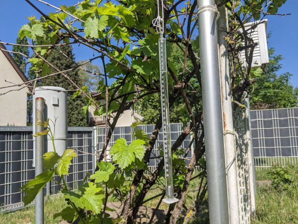So greifen wir zur Messung der Evaporation unter anderem auf ein analoges Piche-Evaporimeter (Foto unten) zurück. Dieses besteht aus einem mit Wasser gefüllten und graduierten Glasröhrchen. Jenes gibt, kopfüber aufgehängt und unten mit einer Papierscheibe abgedichtet, Aufschluss über die tägliche Wasserverdunstung. Eine Füllung entspricht umgerechnet einer Verdunstungsmenge von 30 Litern / m².