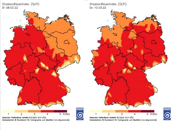 Nicht nur ausbleibende Niederschläge, auch in den kommenden Tagen fällt kein nennenswerter Regen, sind das Problem. Wind und eine niedrige Luftfeuchtigkeit tragen ihr übriges zur brandgefährlichen Lage in Wäldern und Wiesen bei. Weiterhin begleitet uns regional noch immer eine Resttrockenheit aus dem letzten bzw. der letzten Jahre.