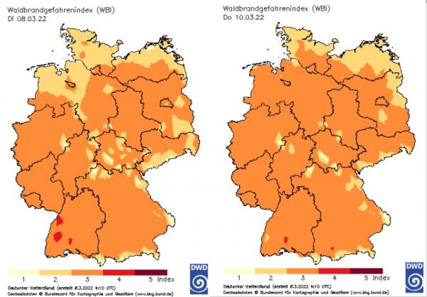 Die Karten zeigen den Waldbrandgefahrenindex des Deutschen Wetterdienstes am heutigen Dienstag sowie am Donnerstag. In weiten Landesteilen liegt dieser in der kommenden Tagen bei Stufe 3.