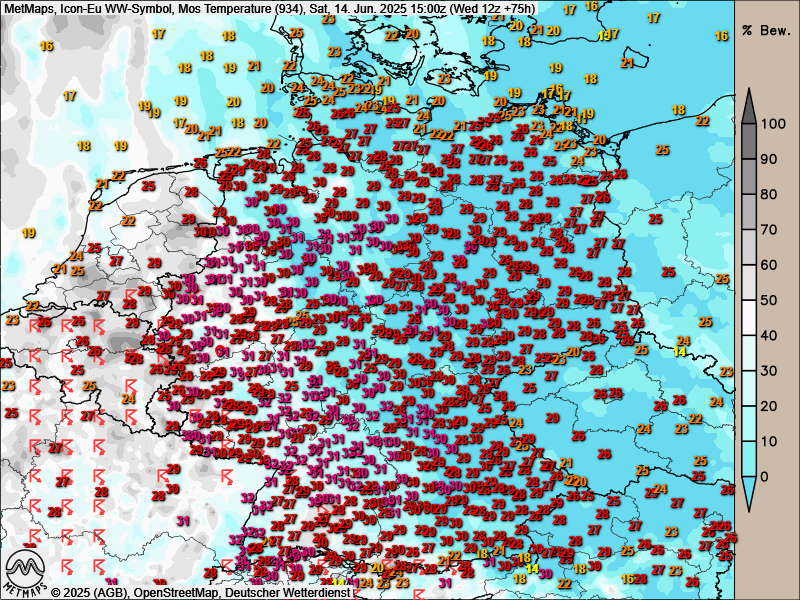 Wetter- / Temperaturkarte Samstag, 15 Uhr (ICON)