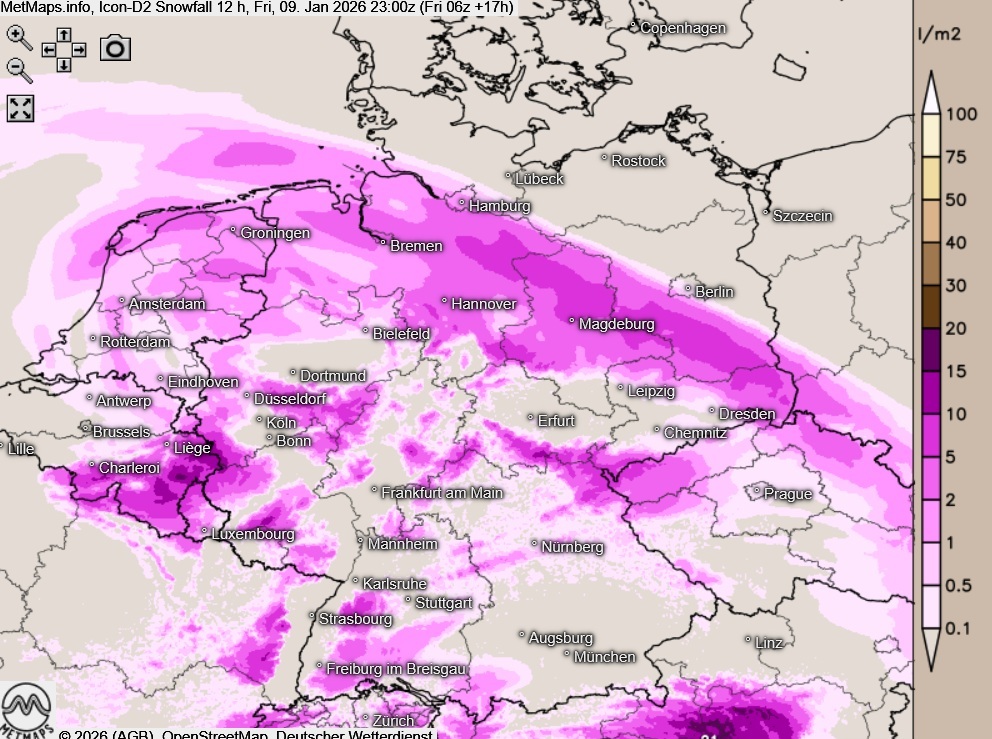 Der Fokus liegt vor allem auf den nördlichen und östlichen Landesteilen: Neben erheblichen Schneemengen (bis zu 15 cm Neuschnee auf einem breiten Streifen von Schleswig-Holstein bis nach Südbrandenburg) sorgen hier zudem starke Böen, Schneeverwehungen und gefrierender Regen für chaotische Zustäde auf den Straßen.