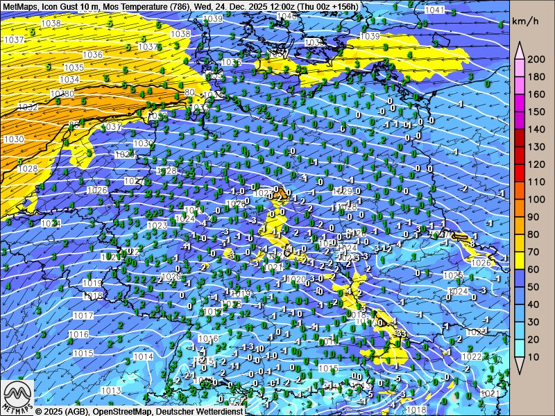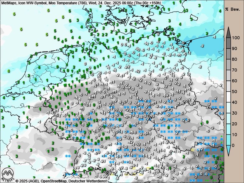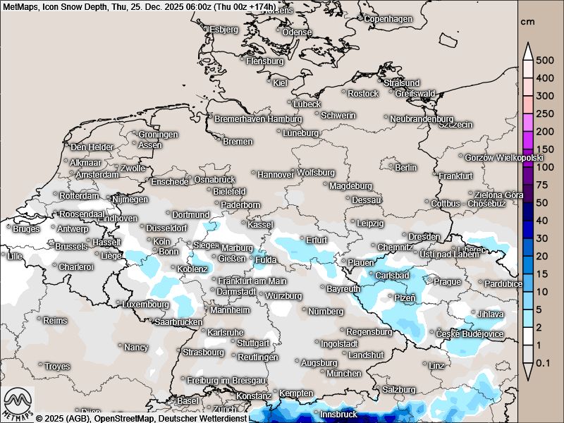 Nach den aktuellen ICON-Berechnungen könnte es insbesondere im Westen und Süden Deutschlands an Heiligabend zeitweise schneien. Begleitet würden diese Niederschläge von östlichen Winden, die sehr kalte Luft heranführen und somit zumindest regional winterliche Bedingungen ermöglichen könnten.