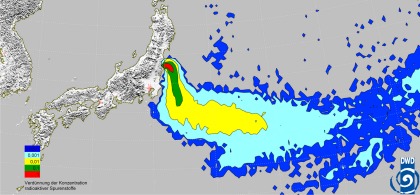 Nach verschiedenen Strömungsberechnungen kann die Luftmasse, die sich über Japan befand, in diesen Tagen über Deutschland ankommen. Allerdings hat sie dabei den tausende Kilometer langen Weg über den Pazifik und Atlantik nehmen müssen, so dass die radioaktiven Teilchen immer mehr verwirbelt und verdünnt wurden. Eine Prognoserechnung des Deutschen Wetterdienstes zeigt die Verdünnung bereits auf dem Pazifik: